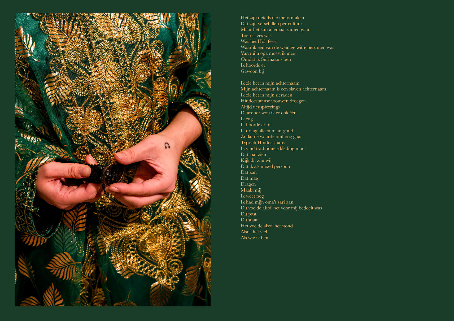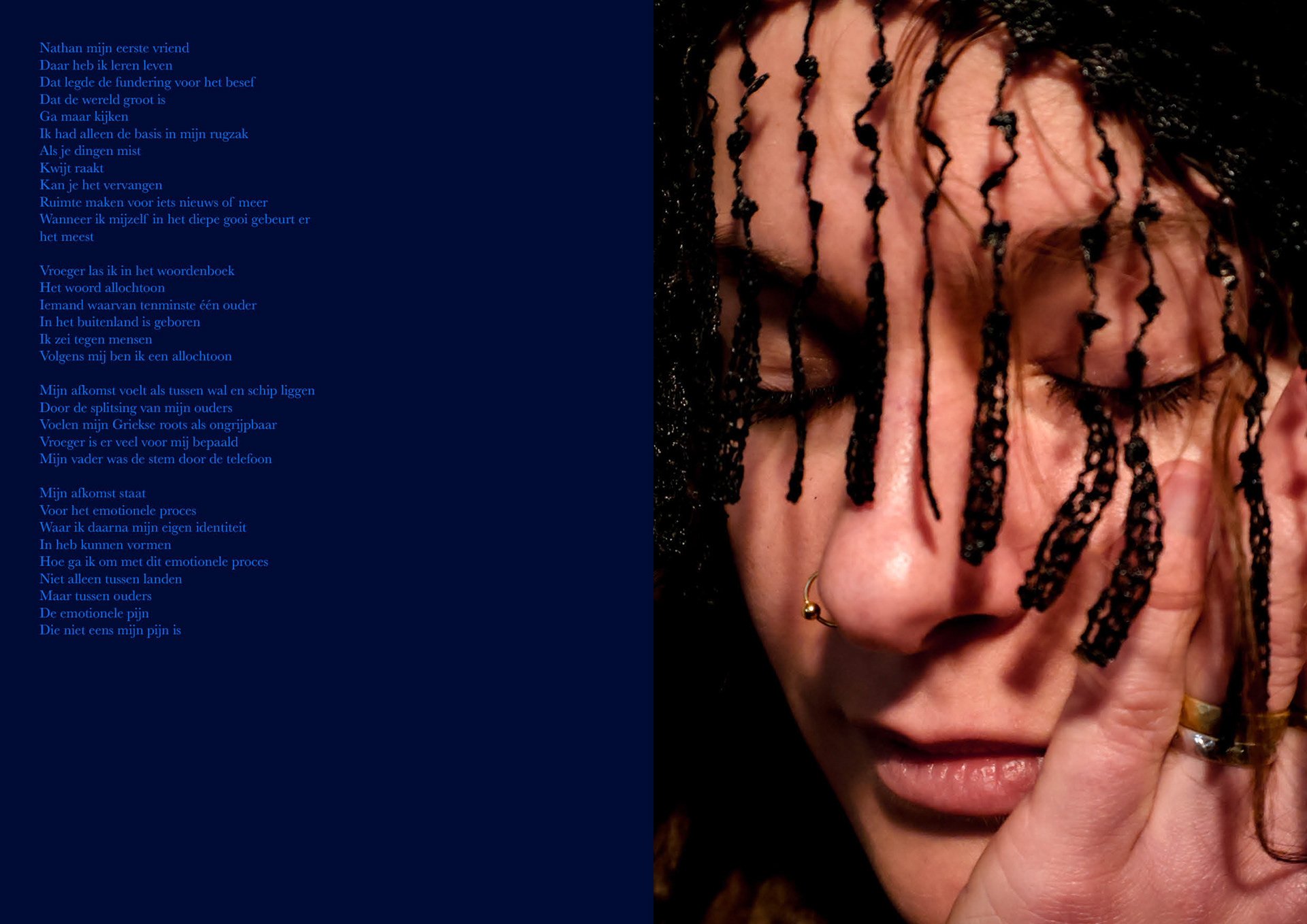 Ik neem je mee langs tien verhalen van jongeren die zijn op gegroeid met verschillende nationaliteiten. Door middel van Poëzie en fotografie. De series zijn ontstaan na deelnamen aan het onderzoek.