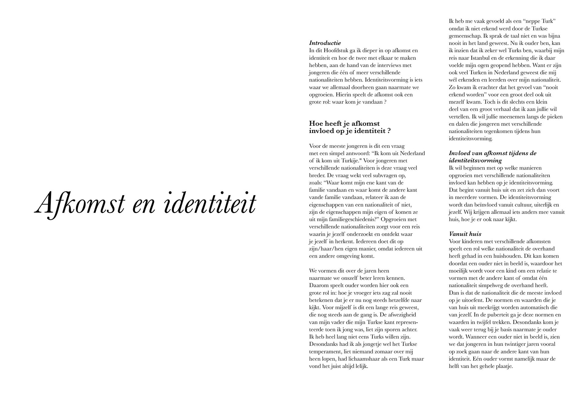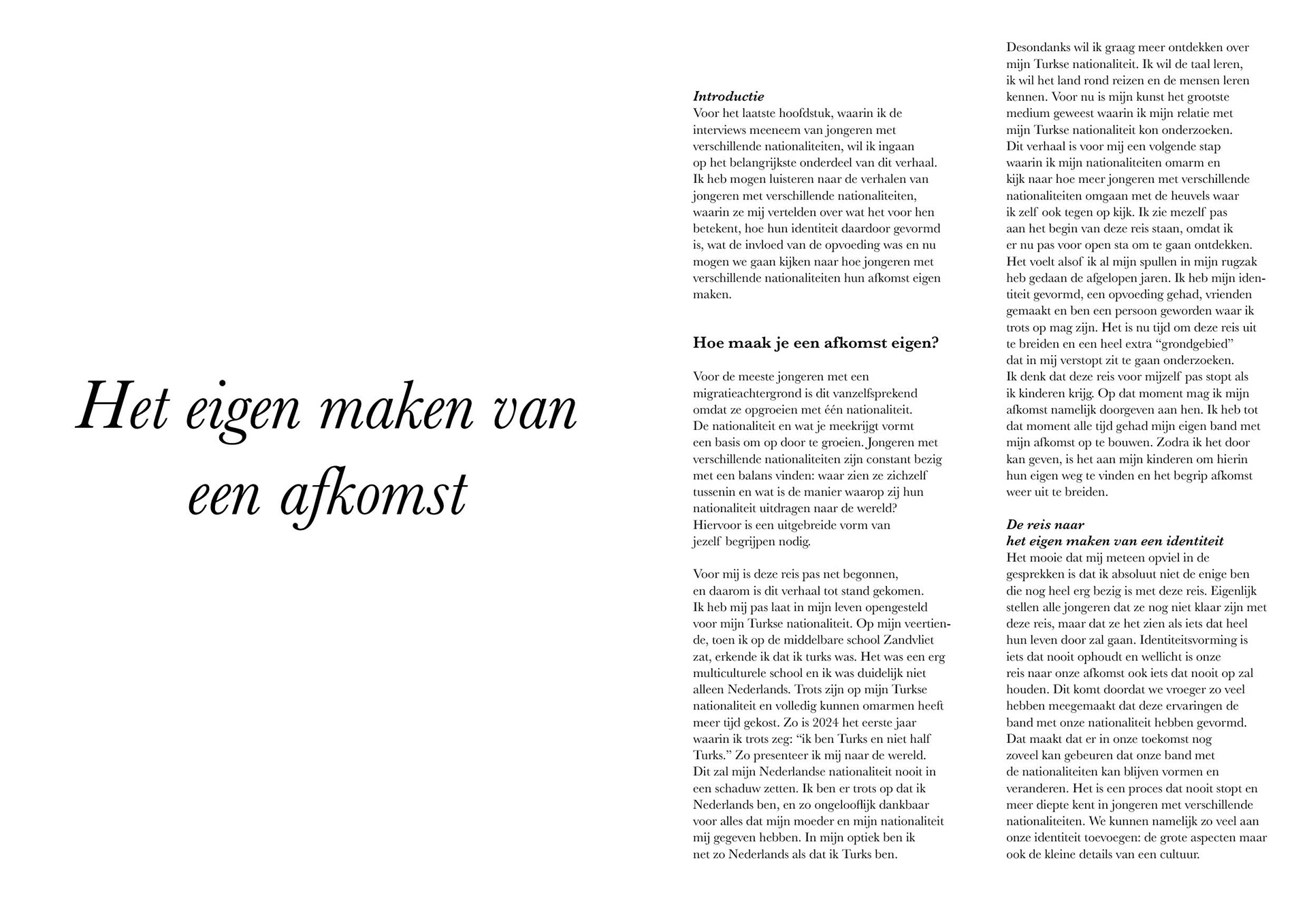 Het boek begint met een uitgebreid onderzoek over het opgroeien met verschillende nationaliteiten. Wat voel je, wat ervaar je, ben je alleen of is er een rode lijn tussen iedereen die opgroeit met meerdere nationaliteiten.